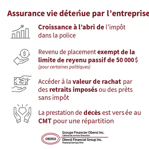 L’assurance vie détenue par la société est donc un outil flexible qui permet de faire croître vos actifs à l’abri de l’impôt tout en procurant une protection financière supplémentaire.
